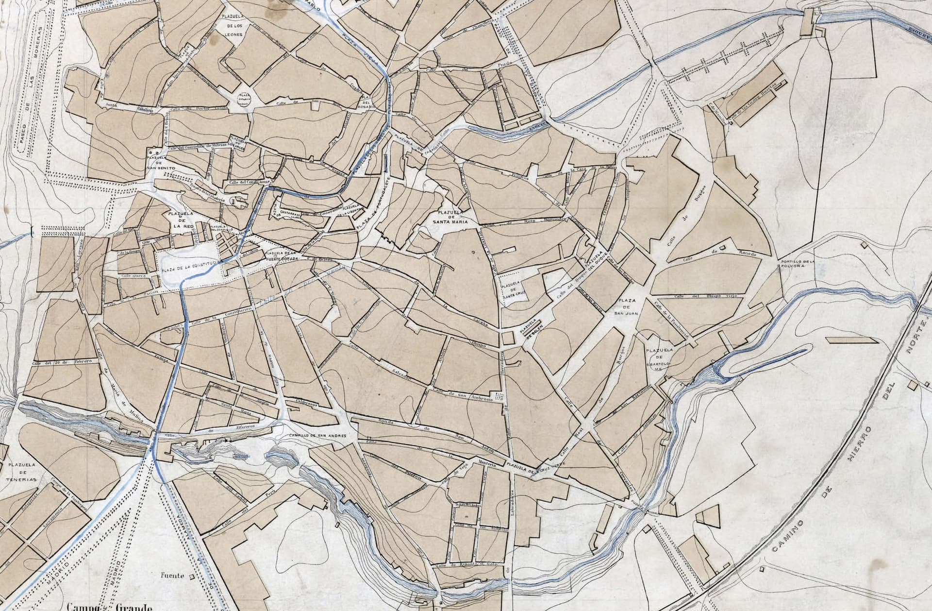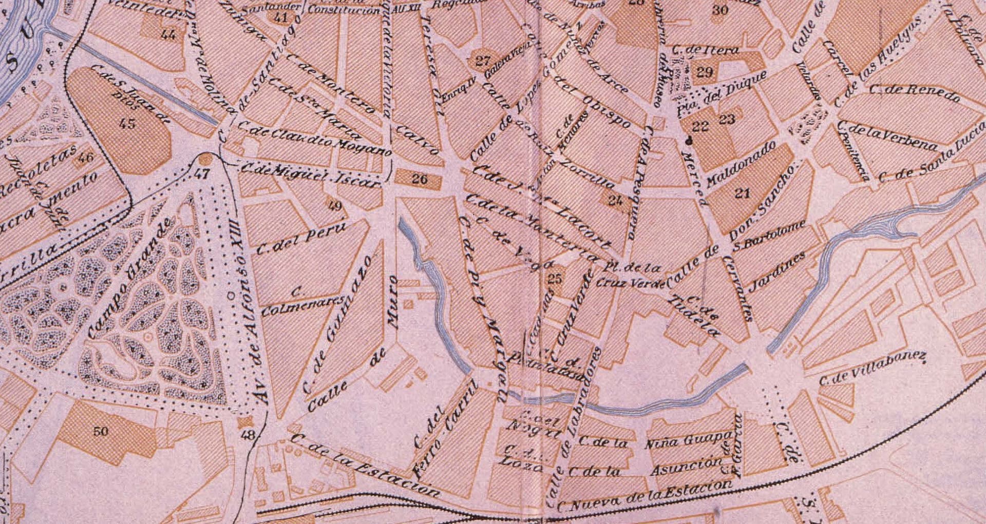 1863. Mientras el ramal norte está muy avanzado (el único segmento extenso sin cubrir es Paraíso), se aprecian los primeros trabajos en el sur (en el Rastro, actual Miguel Iscar). La vía del tren (“Camino de Hierro”) tiene apenas tres años. El trazo azul oscuro de norte a sur no es ningún río, sino el “camino de las aguas” de Argales.