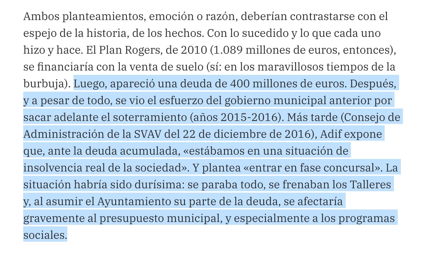 Óscar Puente finalmente logra la alcaldía en 2015 y se compromete con el soterramiento e incluso presenta un plan de siete fases para llevarlo a cabo. Sin embargo, la SVAV tiene una deuda de 404 M€ (114 M€ corresponden a intereses impagados a los bancos).