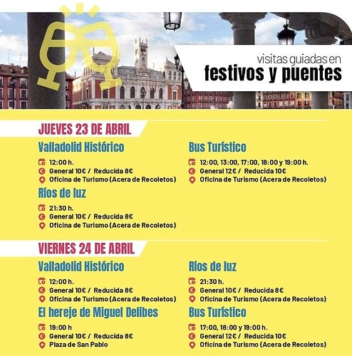 Notas: Existen diferentes rutas como Bus Turístico, Valladolid Histórico, Ríos de luz y El hereje de Miguel Delibes con horarios y precios variados.